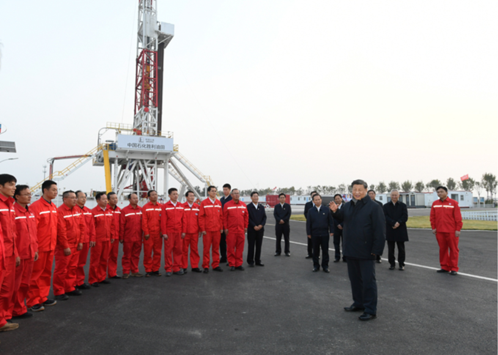 习近平21日下午在位于东营市莱州湾的胜利油田莱113区块考察时,同工人们亲切交流