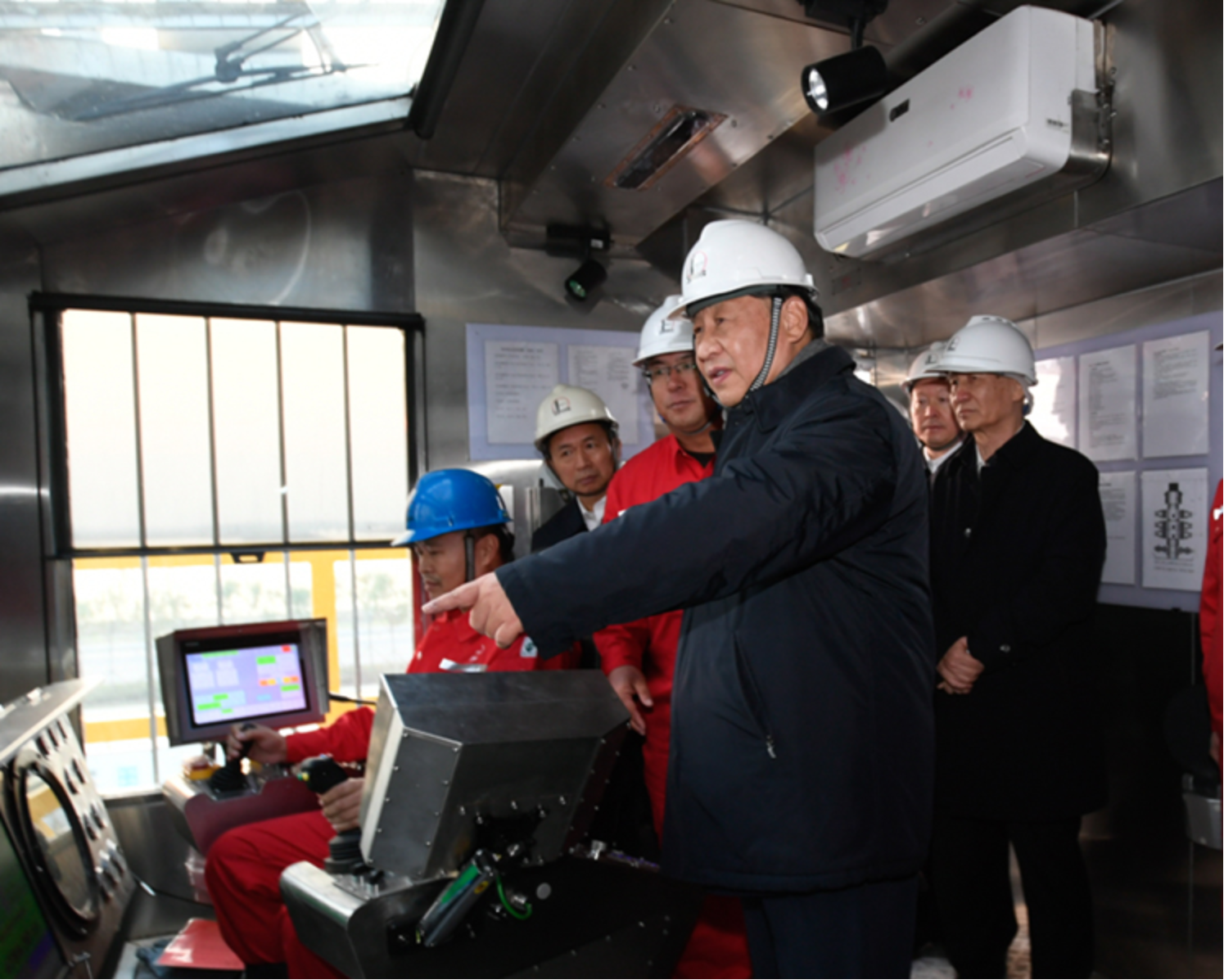 习近平21日下午在位于东营市莱州湾的胜利油田莱113区块考察时,登上二层钻井平台,察看钻井自动化设备
