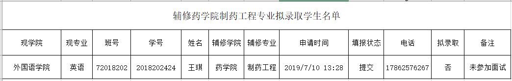 辅修药学院制药工程专业拟录取学生名单