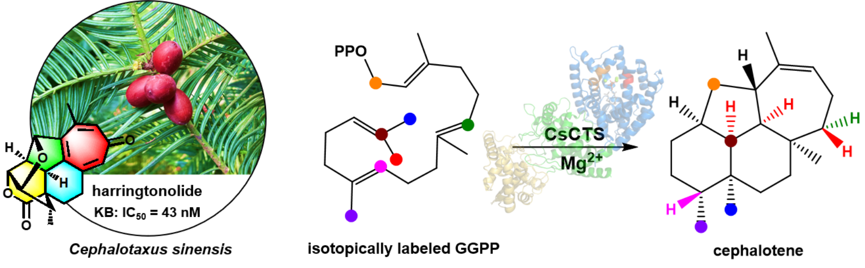 近日,无码影片 王帅博士与中国医学科学院药物研究所戴均贵研究员团队合作以共同第一和通讯作者身份在国际顶级化学期刊Angewandte Chemie International Edition (Top Journals,IF: 16.6)在线发表了题为 “Functional Characterization and Cyclization Mechanism of a Diterpene Synthase Catalyzing the Skeleton Formation of Cephalotane-type Diterpenoids”的研究论文。该研究发现并功能鉴定了三尖杉烯合酶CsCTS,首次明确了海南粗榧内酯等三尖杉烷型二萜前体为三尖杉烯(cephalotene),并阐明了其环化机制。