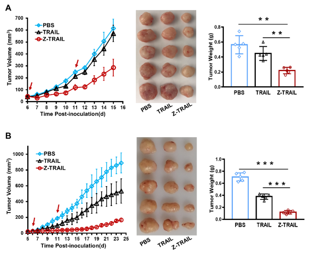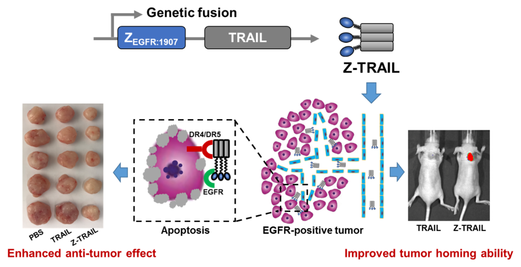3)最后研究Z-TRAIL在体内对肿瘤的靶向和杀伤作用。建立EGFR阳性的A431荷瘤鼠模型,静脉注射荧光标记的TRAIL/Z-TRAIL蛋白,荧光成像活体扫描表明,Z-TRAIL在肿瘤组织中的累积明显高于TRAIL。抑瘤实验表明,Z-TRAIL的体内抗肿瘤效果明显强于TRAIL。安全性评价表明,Z-TRAIL对小鼠不产生明显的毒性。