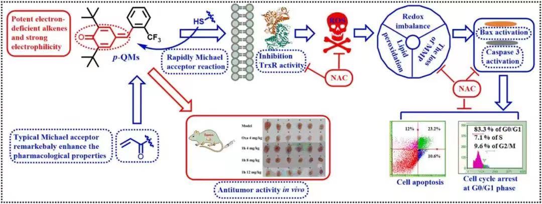 该团队以含经典的缺电子烯烃结构的对亚甲基醌为先导化合物,基于取代基的位置效应和电子效应,设计合成了一系列对亚甲基醌衍生物。探讨了该类药物抗肿瘤的构效关系,证实了其通过抑制TrxR、激活Bax和Caspase3的表达而在体内外表现出良好的抗肿瘤活性,并且在体内具有一定的安全性。该成果以Design, synthesis and antitumor activity of potent and safe para-quinone methides derivatives in vitro and in vivo为题发表在《Biomed. Pharmacother.》(2022,156, 113893)。
