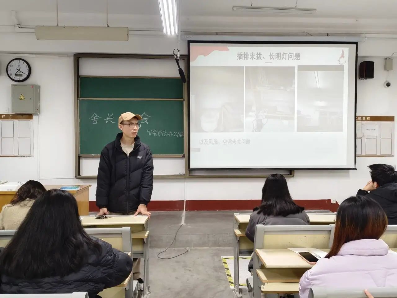 徐致远强调了宿舍卫生和宿舍用电安全两个方面。宿舍卫生方面重申了卫生条例,要求学生严格按照相关规定执行,以图片的形式为学生展示了优秀宿舍和较差宿舍,生动形象的呈现出宿舍标准以及宿舍目前存在的不规范问题。