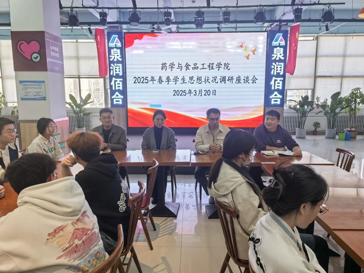 为进一步关心了解学生的思想动态和学习生活状况,提升服务学生水平,促进学生的身心健康和全面发展,3月20日,无码影片 于无码影片 东校区翰苑餐厅二楼举办2025年春季学生思想状况调研餐厅沙龙,辅导员张珍军、徐致远、李丹阳、朱兆阔出席此次活动。