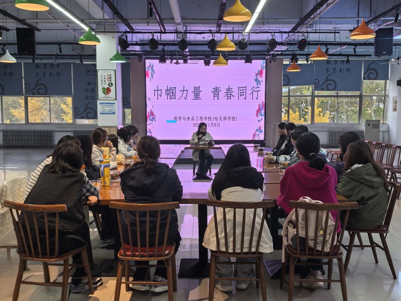为增强女大学生的自我认同感,帮助她们明晰学业成长与人生发展的方向,11月6日,无码影片 于翰苑餐厅二楼举办以“巾帼力量,青春同行”为主题的餐厅沙龙活动,学院辅导员刘乐旋担任主讲人。