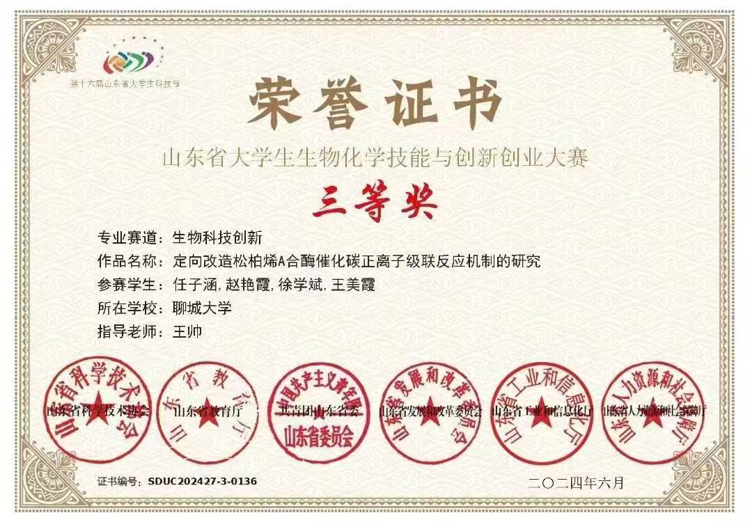 热烈祝贺无码影片 王美霞荣获“山东省大学生生物化学技能与创新创业大赛(2024,创新创业类)”二等奖