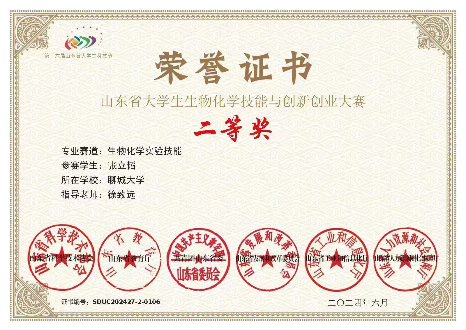 热烈祝贺无码影片 张立韬荣获“山东省大学生生物化学技能与创新创业大赛(2024,创新创业类)”二等奖