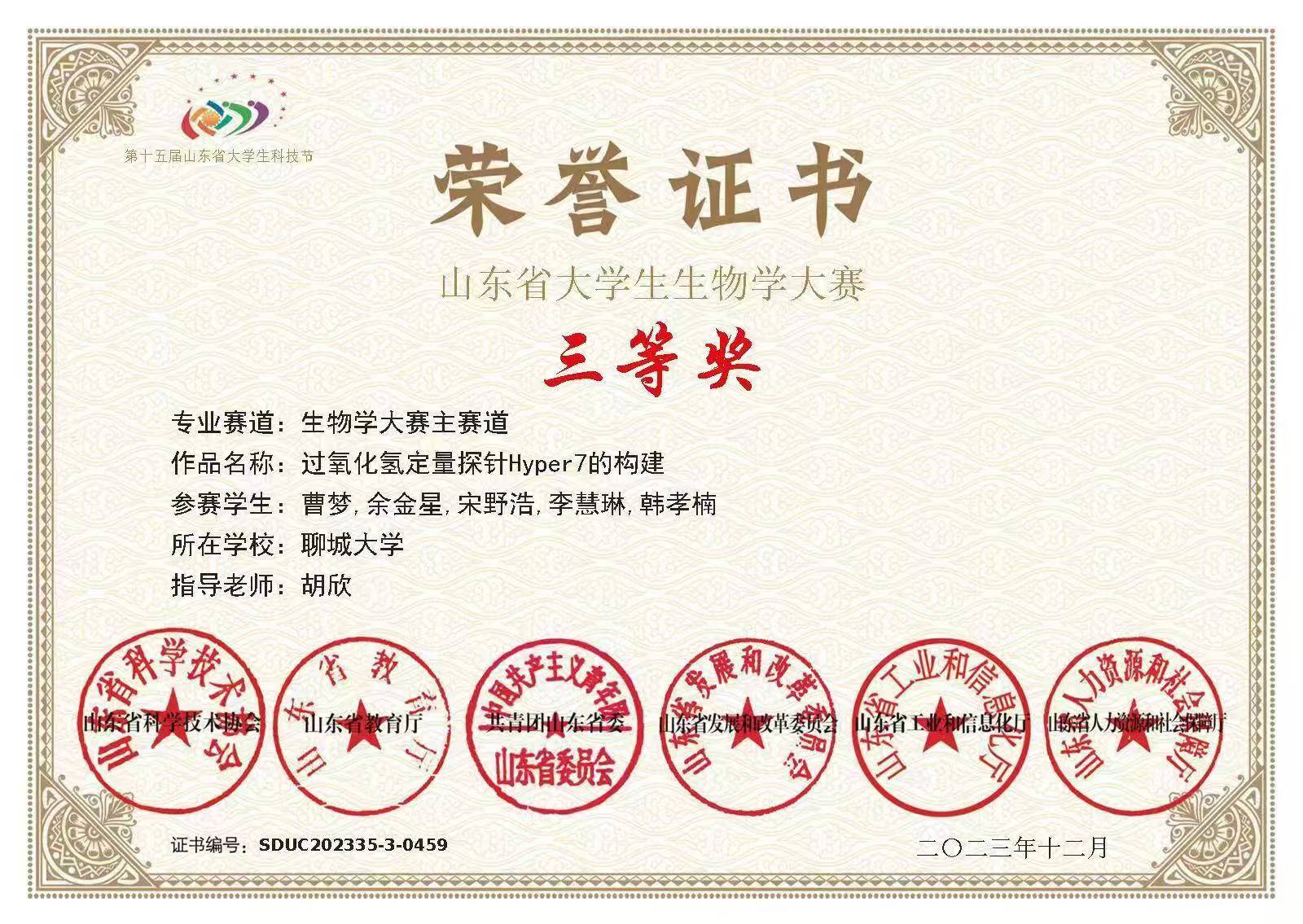 热烈祝贺无码影片 宋野浩荣获“山东省大学生生物学大赛(2023,科学研究类)”三等奖