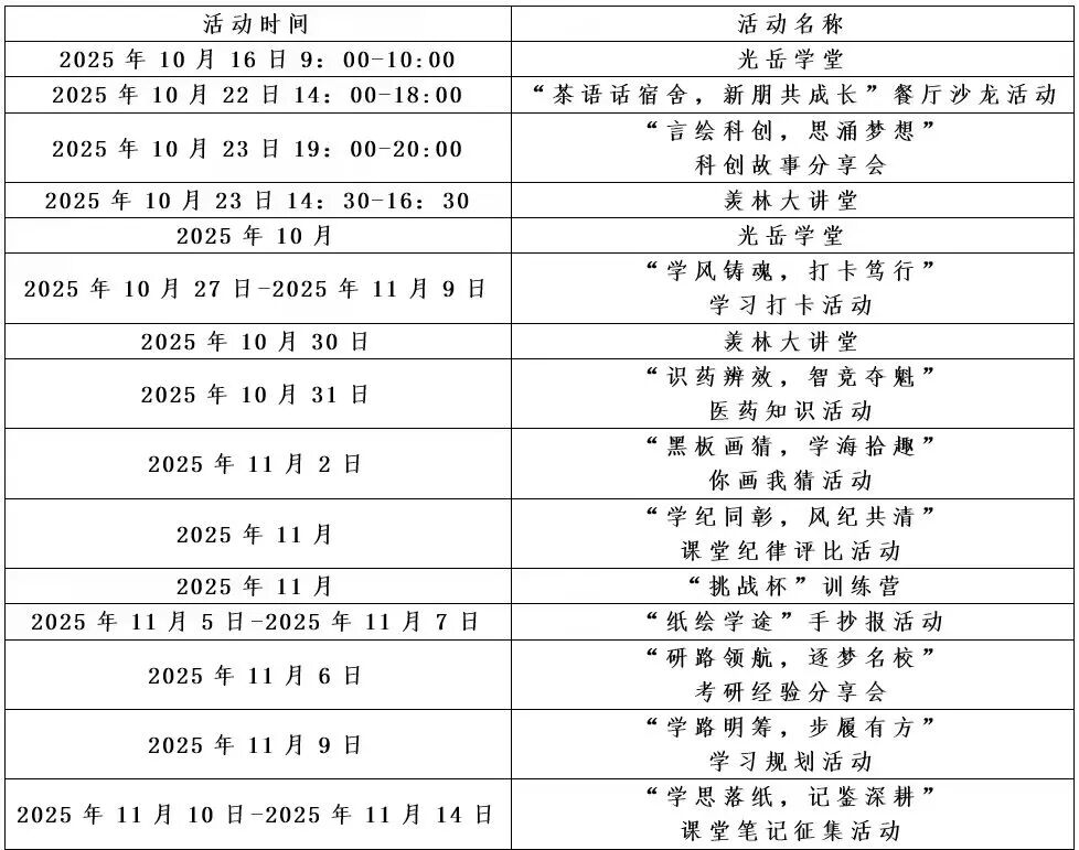 从宿舍环境建设到课堂纪律规范,从科创思维启发到升学方向指引,本次学风建设月活动覆盖“自律养成、趣味互动、成果展示”三大维度,为不同需求、不同年级的学子提供多元成长平台。希望全体同学积极参与、主动投入,在活动中收获知识、提升能力、结交伙伴,让勤奋学习成为青春底色,让笃行实干成为成长常态,共同为学院优良学风建设注入青春力量!