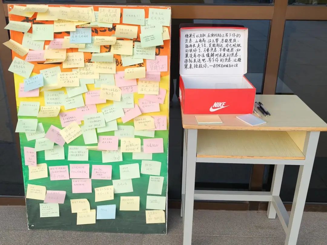 活动现场,学生积极参与,他们将深藏已久的情绪诉诸笔尖,在便签纸上写下自己的心愿心语、开心时刻或焦虑问题并贴在展板上。一张张的便签上写着各种烦恼,一句句鼓励的话语让焦虑得到释放,心理展板上色彩缤纷的便签与文字是他们摆脱焦虑踏出的重要一步,同时他们将暖心的安慰互相传递在别人的鼓励中,在表达自己情感与想法的同时传递正能量。小小的便签纸,寄托了千丝万缕的情绪,参与此活动的学生纷纷表示,在写下便签的时刻,愿望好像有了实感,从文字中感受到陌生人给予的温暖使自己重新认识到了自身潜力,化负面情绪为动力,激励着自己为美好未来而奋斗。
