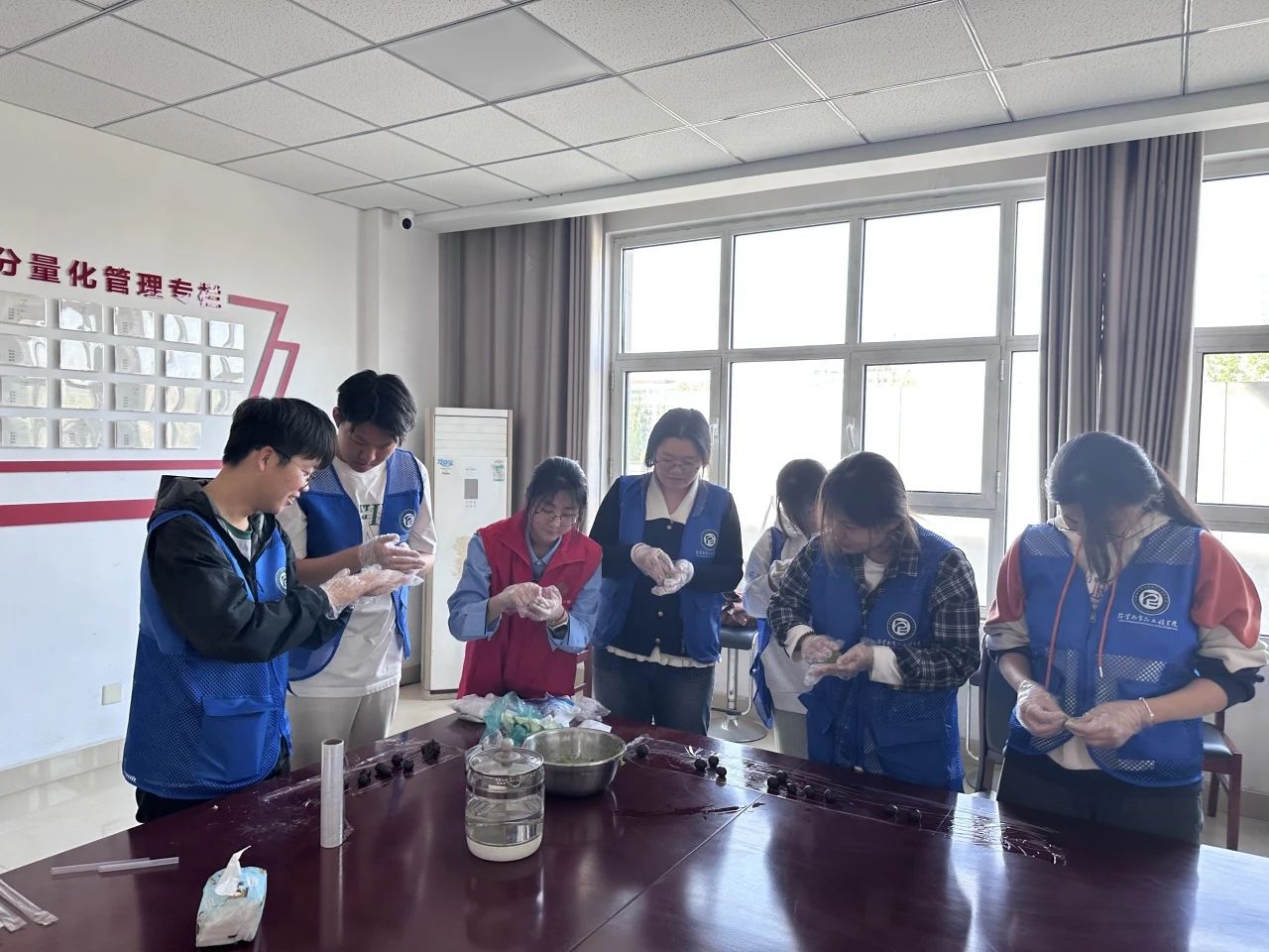 活动当日,团队成员把预先备好的青团粉、开水、豆沙馅料及各类制作工具有序摆放。他们依照制作流程,将青团粉徐徐倒入盆内,接着加入适量开水,快速进行搅拌。在制作过程中,团队成员积极邀请社区居民一同参与,手把手教授居民包青团的步骤与技巧。