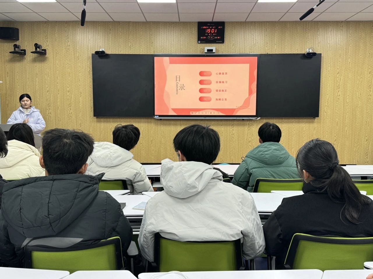 活动伊始,团队成员详细展示了心肺复苏的每一个关键步骤,从判断现场环境安全,到轻拍并呼喊患者以确认其意识,再到检查呼吸和脉搏,使学生在面对紧急情况时,能够迅速做出反应并精准地进行操作。实践环节中,学生亲自进行心肺复苏模拟练习,团队成员则为学生提供一对一的指导,纠正手法、调整按压频率与深度,以及规范呼吸配合的细节。经过反复的练习,学生逐渐掌握了心肺复苏的操作要领。活动末尾,团队成员为学生播放精心准备的视频,该视频详细讲解了海姆立克急救法的原理与操作方法,进一步加深了学生对应急救护的了解,提升了他们对生命的敬畏与主动施以援手的责任感。