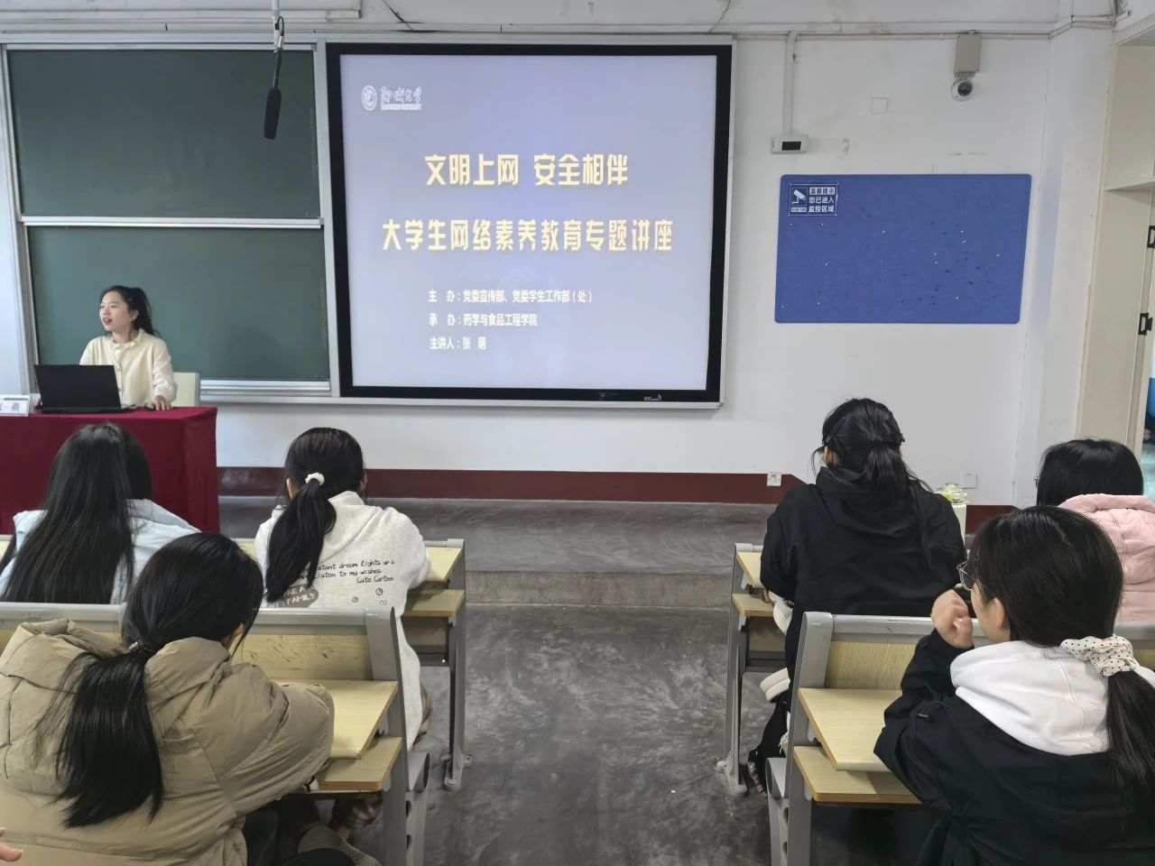 张萌结合具体案例围绕培养大学生网络素养这一主题展开讲解,详细为同学们讲述了如何保护个人信息、如何防止网络诈骗、如何避免网络暴力的方法,并鼓励同学们合理利用网络资源进行创新与创造性思维的培养。最后,张萌为同学们准备了一个饱含意义的小品,让学生在轻松愉快的氛围中深刻领会网络素养教育的重大意义,引导同学们要合理安排自己的时间,合理运用网络。现场同学仔细聆听、认真观看、积极互动,纷纷表示受益匪浅,并承诺会在今后的网络生活中自觉抵制不良信息,遵循法律规范,坚定政治立场,传播正能量,也会为营造良好的网络环境贡献自己的一份力量。