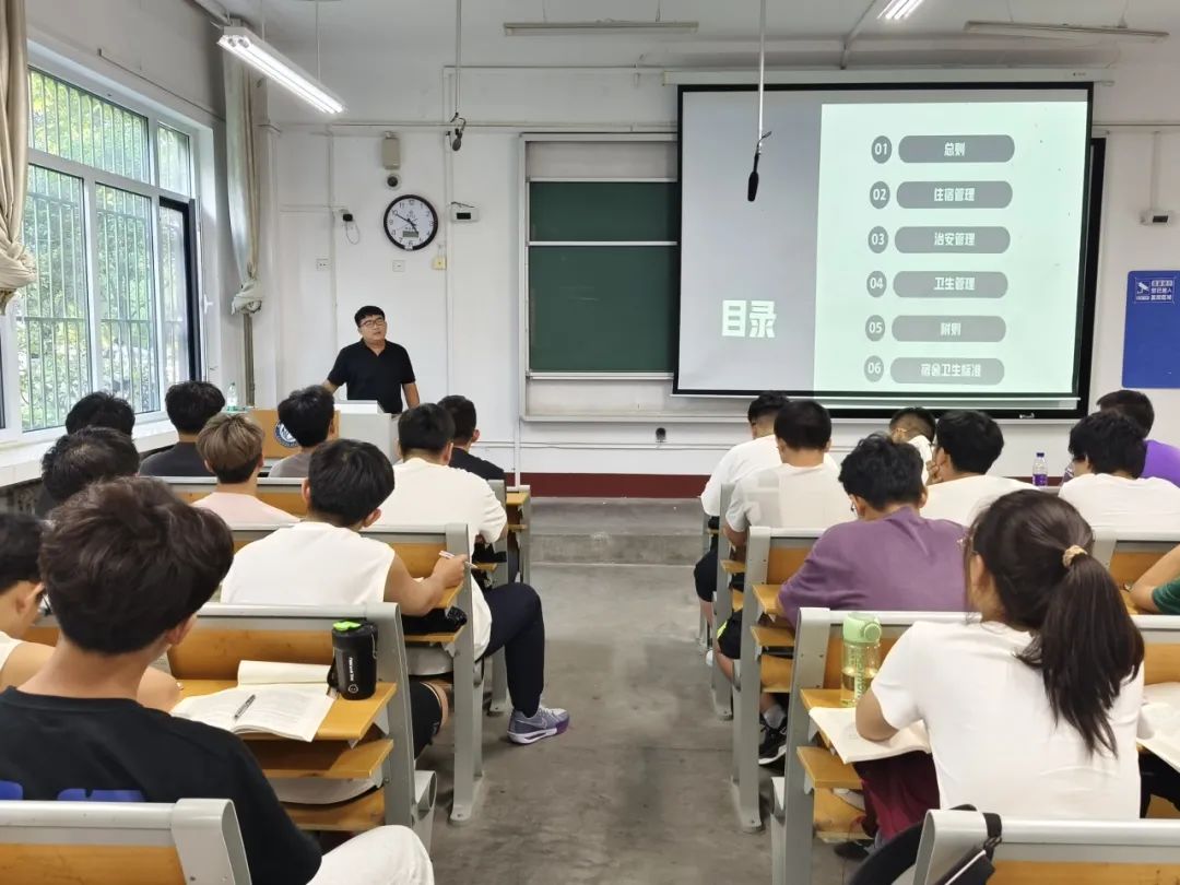 会上,张珍军从总则、住宿管理、治安管理、卫生管理、附则及宿舍卫生标准六个方面对《学生公寓管理规定》进行了全面而细致的解读。他先对学生公寓管理的基本情况进行了介绍,强调公寓行为规范的重要性,并通过案例分析对学生公寓管理制度进行了细致的讲解,希望学生们切实提高宿舍安全和卫生意识,增强遵守校纪校规的意识,严格遵守宿舍管理规定。同时强调了学生在校园内外的安全意识和自我保护能力的培养,提醒新生要警惕各类安全风险,如校园财产安全、人身安全等。
