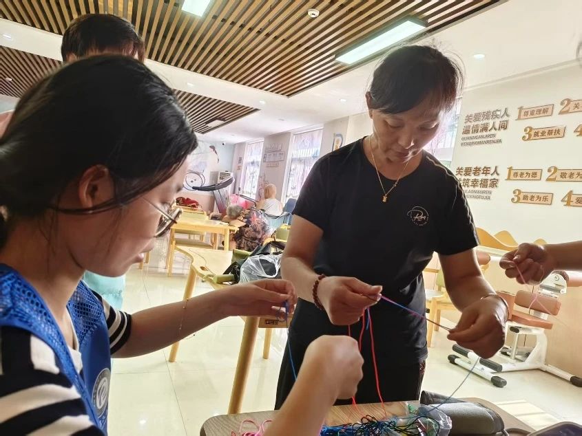 活动伊始,团队成员向老人们讲解五彩绳的文化寓意与编织技巧,通过现场演示帮助老人掌握传统手工艺制作方法。随后,团队成员开展五彩绳DIY环节,手把手指导老人们选线配色,共同学习编织手法。在编织过程中,团队成员与老人们密切配合,从线材选择到花纹编织都认真投入,一根根彩线在指尖穿梭,逐渐变成精美的五彩手绳,传递着温暖的祝福。制作完成后,团队成员与老人们合影留念,现场氛围温馨融洽。团队成员纷纷表示此次活动不仅提升了动手能力,同时在与老人们的互动中感受到了传统文化的魅力,今后将继续开展敬老爱老活动,让尊老敬老的美德蔚然成风。