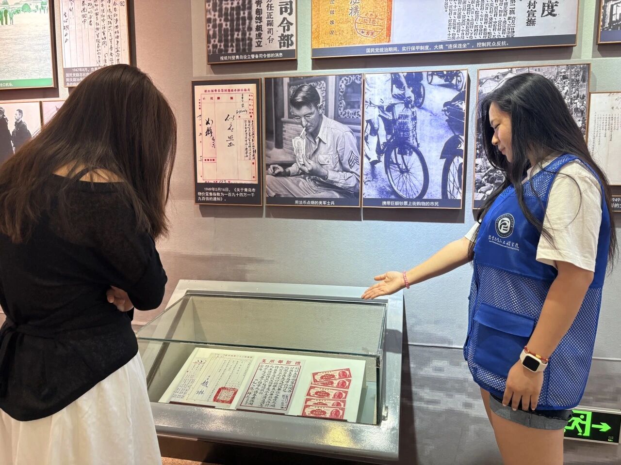 活动伊始,团队成员有序进入展馆,自主参观了“美蒋统治”“巩固统治”等展区,通过陈列的史料、图片与文物,团队成员深入了解相关历史背景,理解了那段特殊历史时期的社会结构与治理方式。随后,团队成员结合展板内容,为来访游客介绍了青岛在近代历史中的战略地位与多重经历,游客们凝神聆听,不时提问,对这段复杂的历史表现出了浓厚的兴趣。团队成员围绕历史事件的意义、先辈精神传承展开思考,在与游客的互动中深化了对历史脉络的认知,并传递了铭记历史、珍爱和平的理念。活动结束后,团队成员纷纷表示此次活动在深刻感受到历史的厚重的同时感悟到了精神的传承,未来将以史为鉴,在实践中传承奋斗精神。