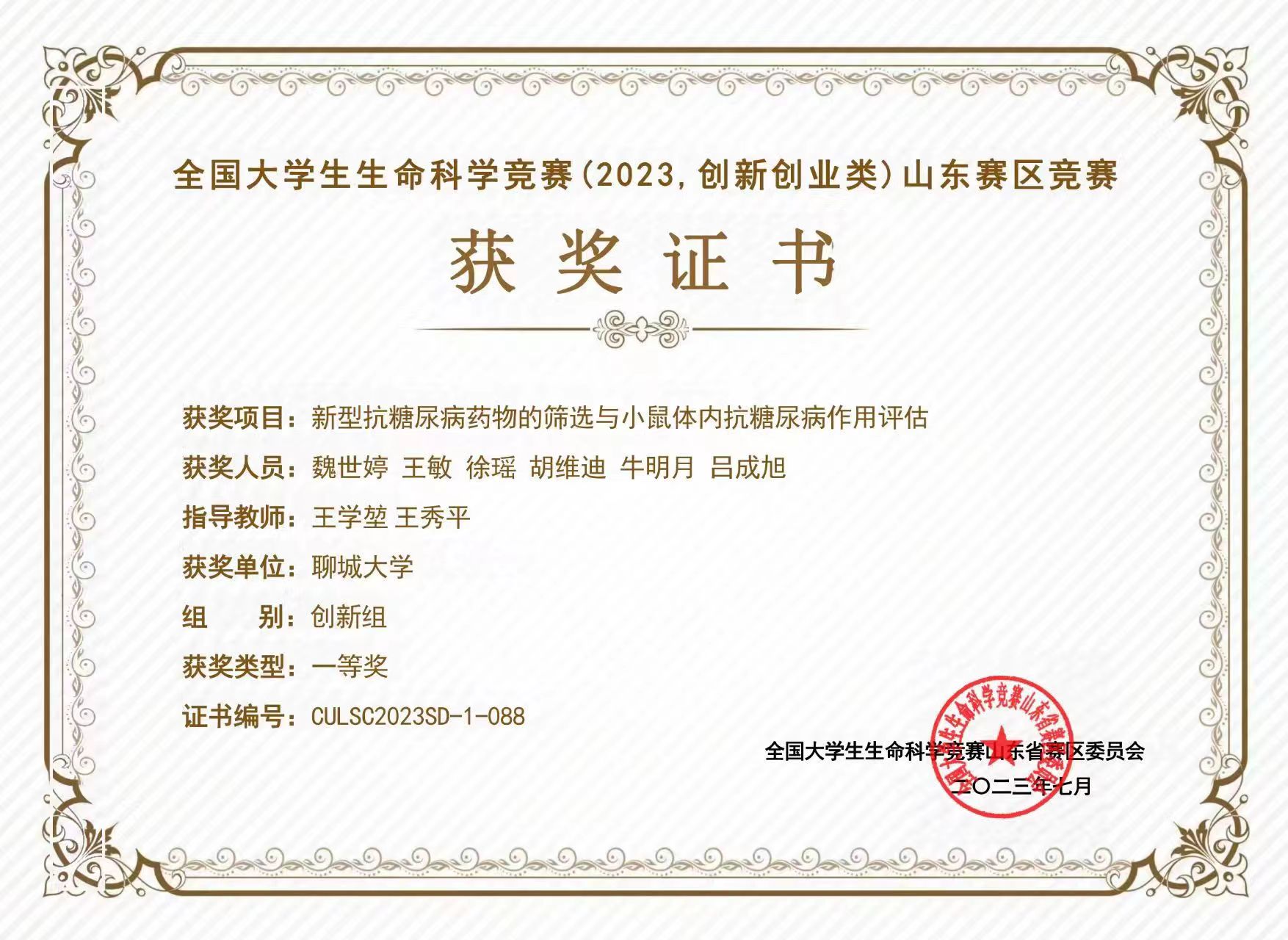 热烈祝贺药学院胡维迪荣获“全国大学生生命科学竞赛(2023,创新创业类)山东赛区竞赛”一等奖