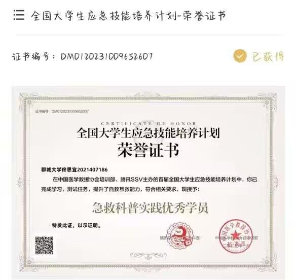 热烈祝贺药学院佟思宜荣获“全国大学生应急技能培养计划”荣誉证书