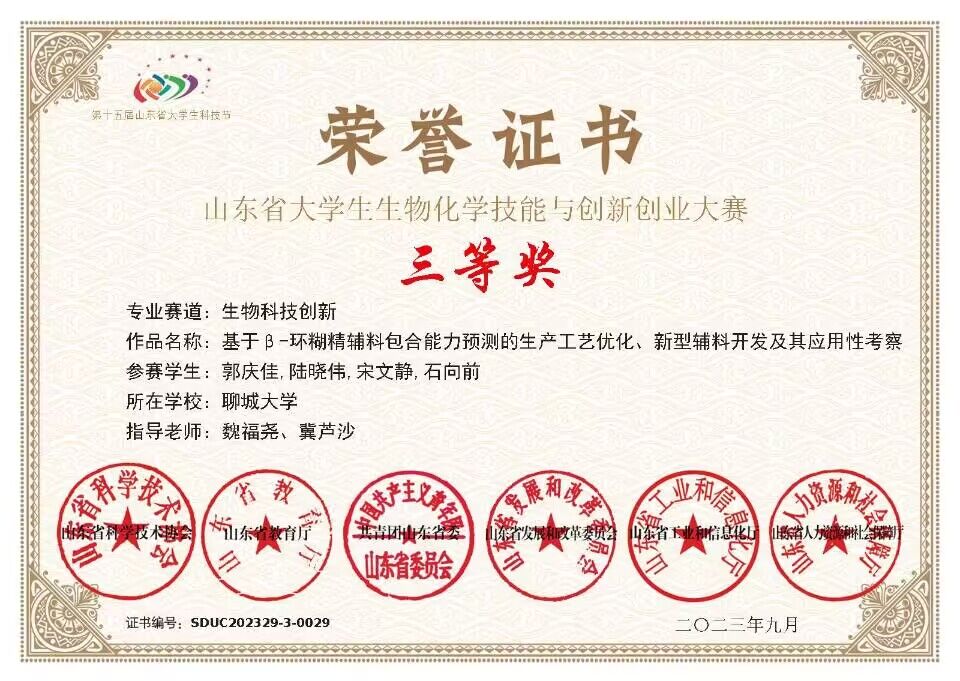 热烈祝贺药学院宋文静荣获“山东省大学生生物化学技能与创新创业大赛”三等奖