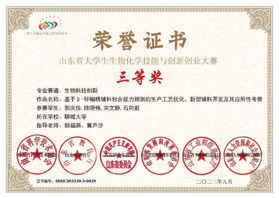 热烈祝贺药学院郭庆佳荣获“山东省大学生生物化学技能与创新创业大赛”三等奖