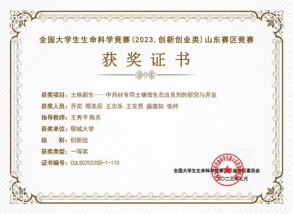 热烈祝贺药学院王忠乐荣获“国大学生生命科学竞赛(2023,创新创业类)山东赛区”一等奖