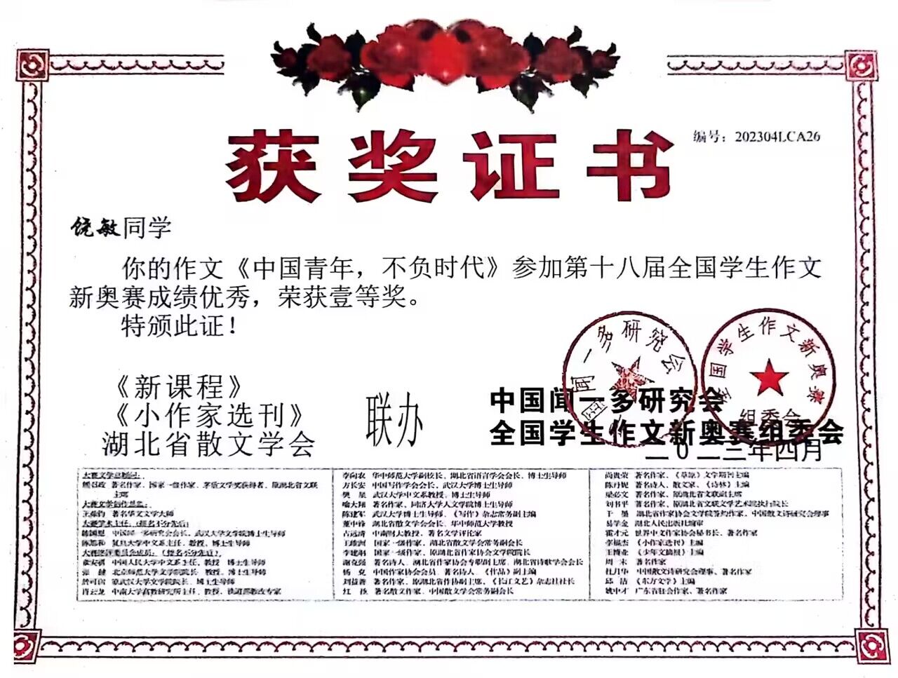 热烈祝贺药学院饶敏荣获“第十八届全国学生作文新奥赛”一等奖