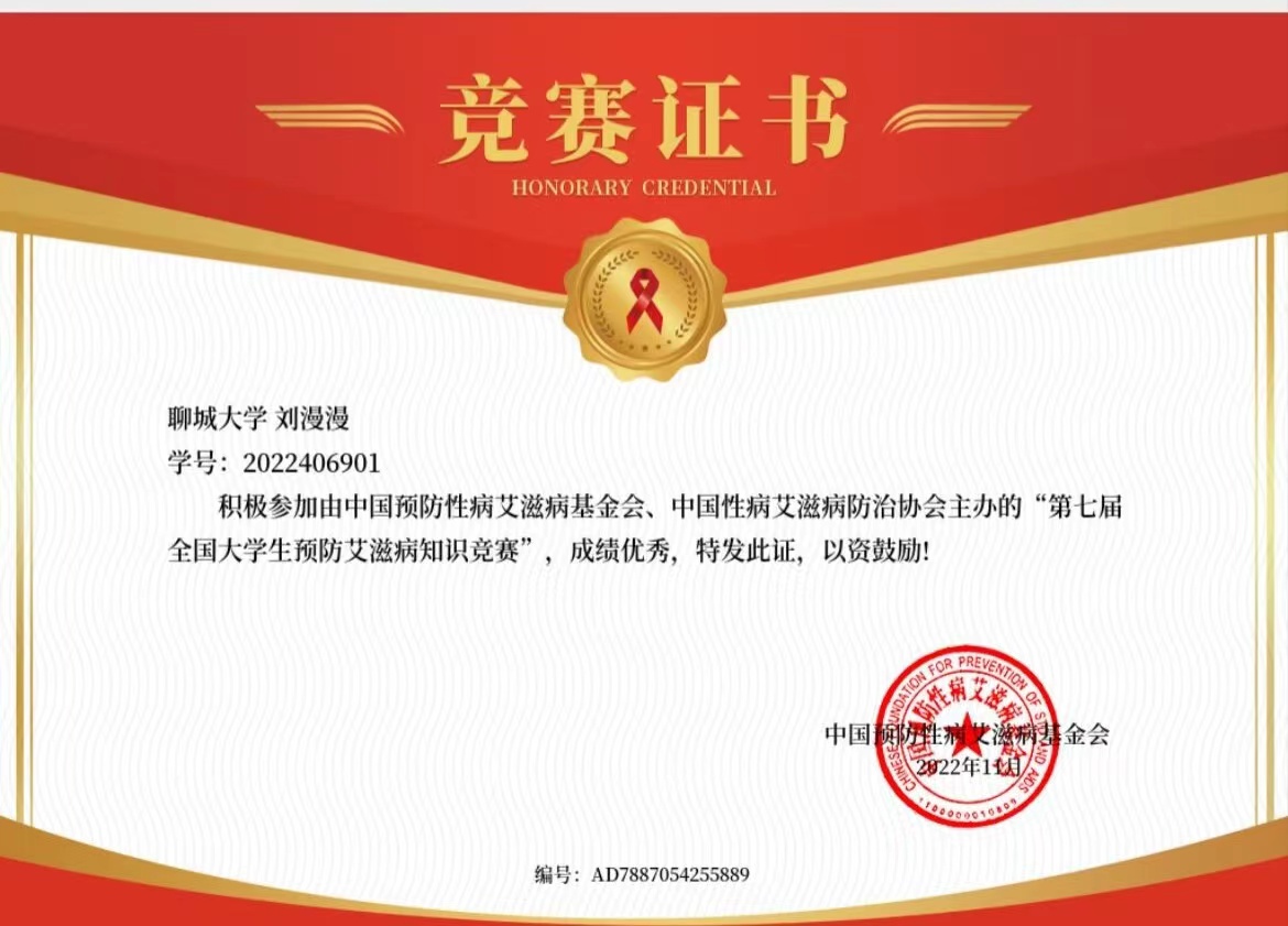 热烈祝贺药学院刘漫漫荣获“第七届全国大学生预防艾滋病知识竞赛”优秀奖