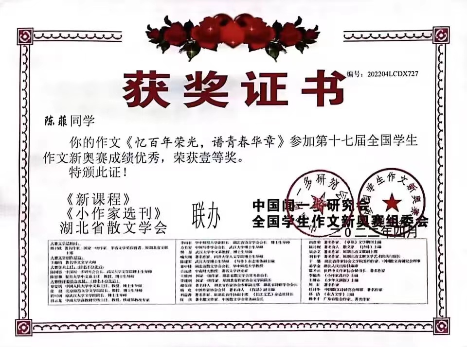 热烈祝贺药学院陈菲荣获“第十七届全国学生作文新奥赛”一等奖