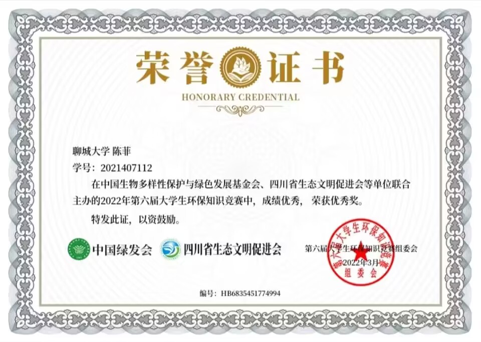 热烈祝贺药学院陈菲荣获第六届大学生环保知识竞赛优秀奖