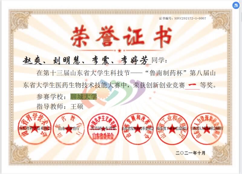 热烈祝贺药学院李震荣获山东省大学生科技节生化实验技能大赛一等奖