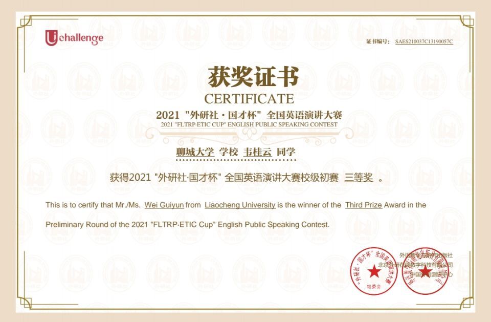 热烈祝贺药学院韦桂云荣获2021“外研社国才杯”全国英语演讲大赛校级初赛三等奖