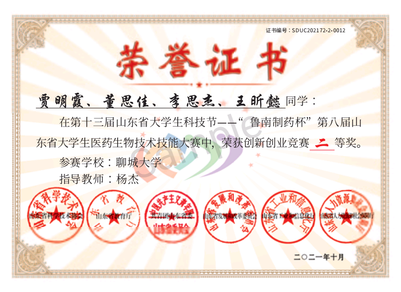 热烈祝贺药学院李思杰荣获第十三届山东省大学生科技节“鲁南制药杯”第八届山东省大学生医药生物技术技能大赛获创新创业竞赛二等奖