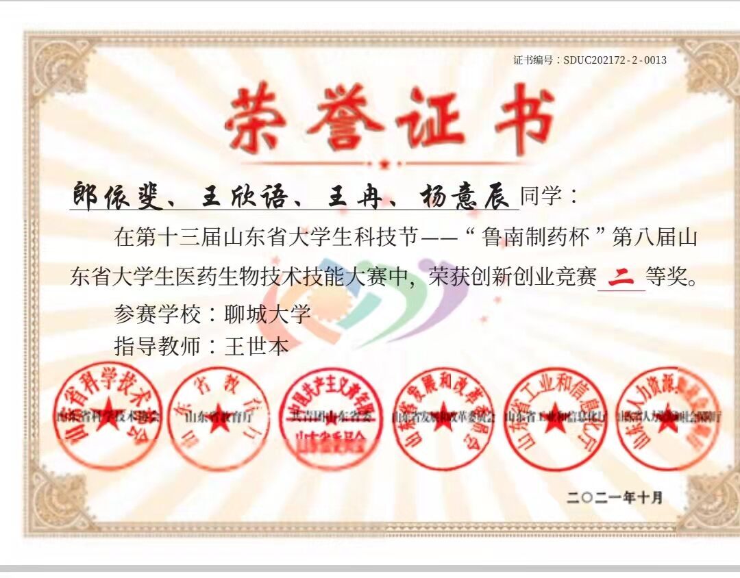 热烈祝贺药学院王冉荣获第十三届山东省大学生科技节“鲁南制药杯”第八届山东省大学生医药生物技术技能大赛获创新创业竞赛二等奖