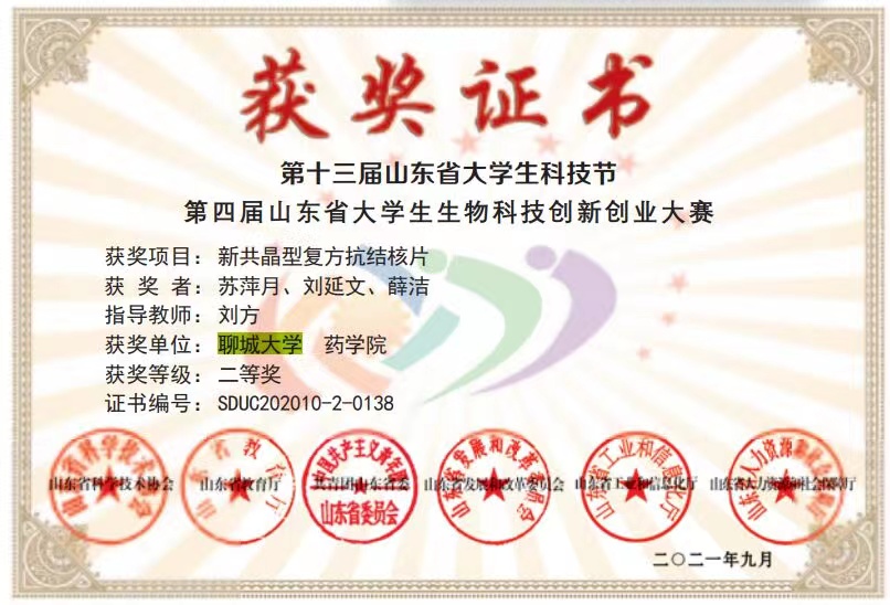 热烈祝贺药学院苏萍月荣获第十三届山东省大学生科技节第四届山东省大学生生物科技创新创业大赛二等奖