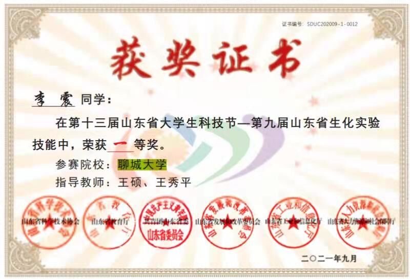 热烈祝贺药学院李震荣获山东省大学生科技节医药生物技术技能大赛创新创业竞赛一等奖