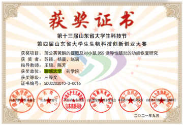 热烈祝贺药学院苏颖荣获第十二届山东省大学生科技节第四届“滋百农生物杯”山东省大学生生物科技创新创业大赛三等奖