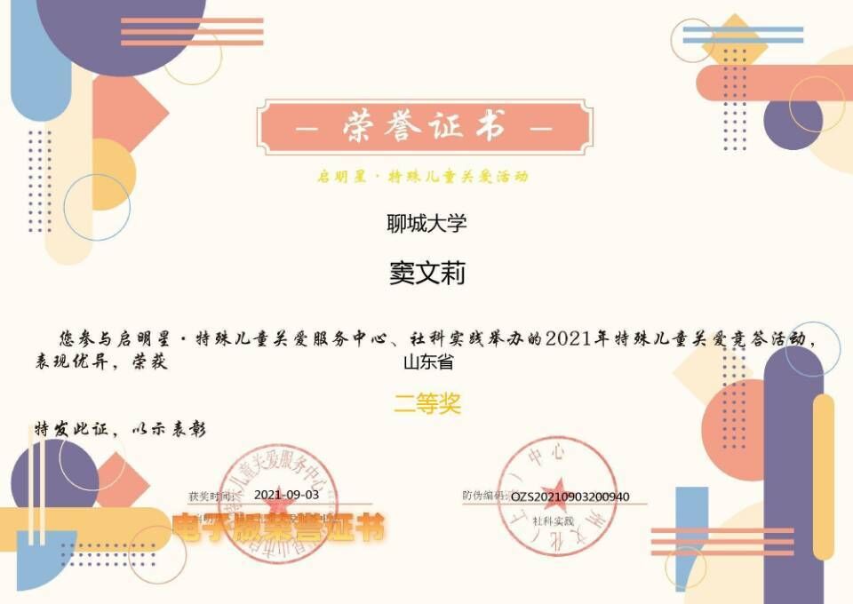 热烈祝贺药学院窦文莉荣获2021年启明星特殊儿童线上关爱活动二等奖