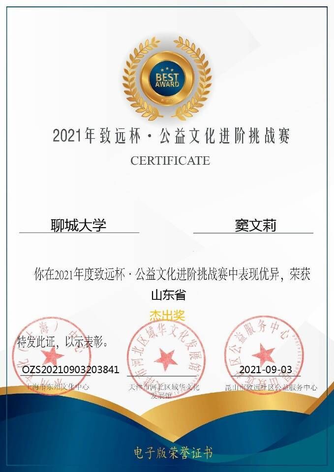 热烈祝贺药学院窦文莉荣获2021年致远杯·公益文化进阶挑战赛杰出奖