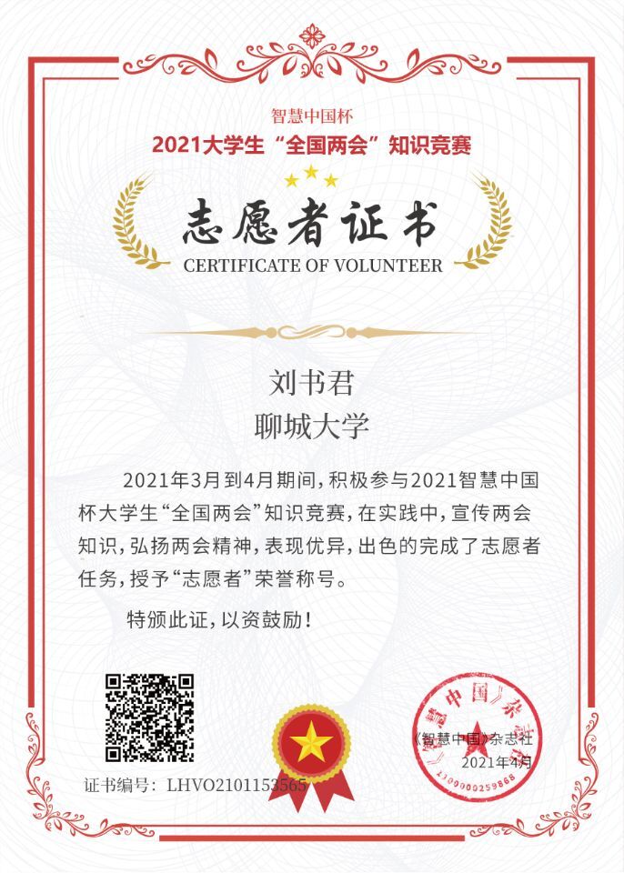 热烈祝贺药学院刘书君荣获志愿者证书