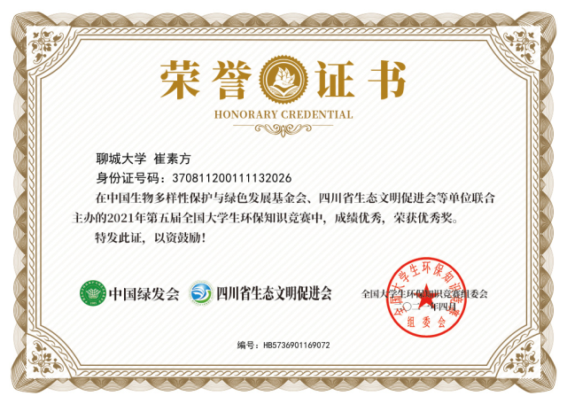 热烈祝贺药学院崔素方荣获2021年第五届全国大学生环保知识竞赛中优秀奖