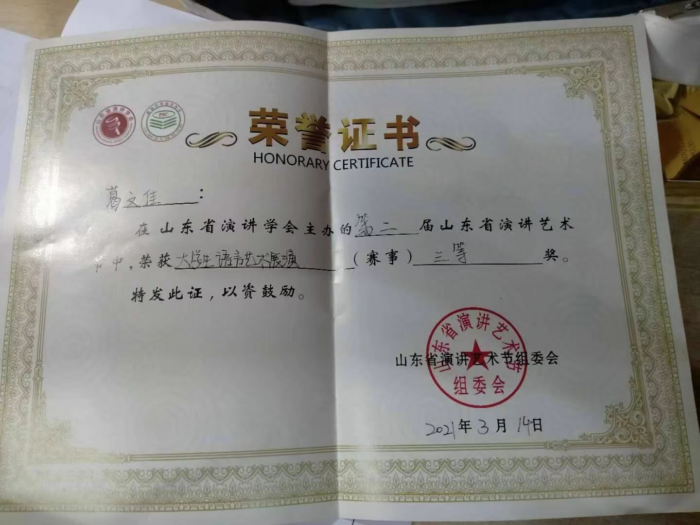 热烈祝贺药学院葛文佳荣获第二届山东省大学生语言艺术展演三等奖