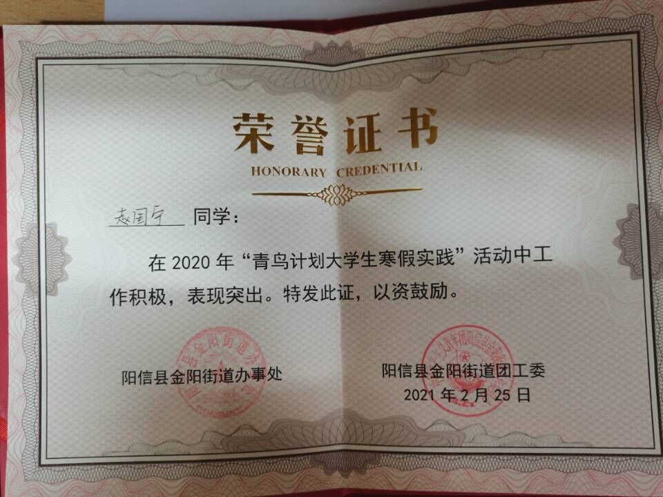 热烈祝贺药学院赵国宁荣获“青鸟计划大学生寒假实践”活动荣誉证书