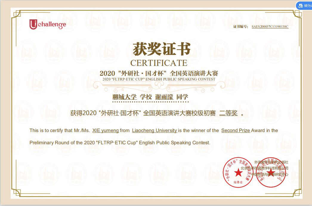 无码影片 谢雨濛获“2020年国才杯全国英语演讲大赛”二等奖