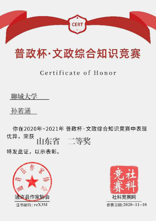 无码影片 孙若涵获“普政杯文政综合知识竞赛”二等奖