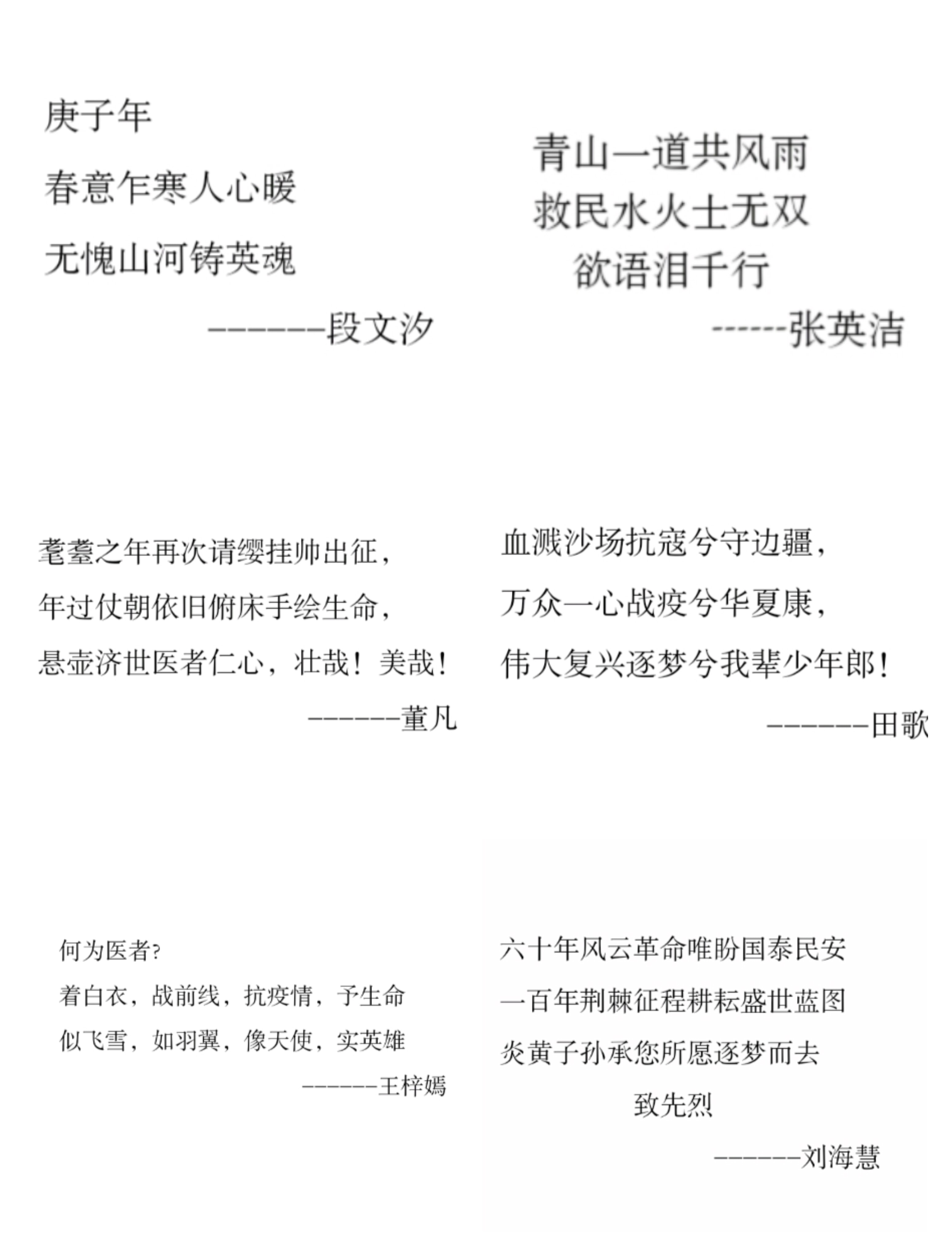 为帮助学生了解中华民族自强不息的伟大民族精神,表达对保家卫国、英勇牺牲的疫情前线英雄以及革命烈士的深切缅怀,学生们书写下对英雄英烈的崇敬感恩之情。活动开始前,团队成员提前制定评选标准并分配好各班相应负责人,之后在班级群向学生们说明作品要求并宣传此次活动的积极作用,鼓励大家积极报名。此次活动中,学生们真正了解了“哪有什么岁月静好,不过是有人替我们负重前行”,也明白了要珍惜现在来之不易的生活,更加主动勤奋地投入到今后的学习和生活中去。参加活动的作品由评审根据评选标准进行层层筛选后,田歌获得一等奖,段文汐、王梓嫣获得二等奖,张英洁、董凡、刘海慧获得三等奖,至此活动圆满结束。