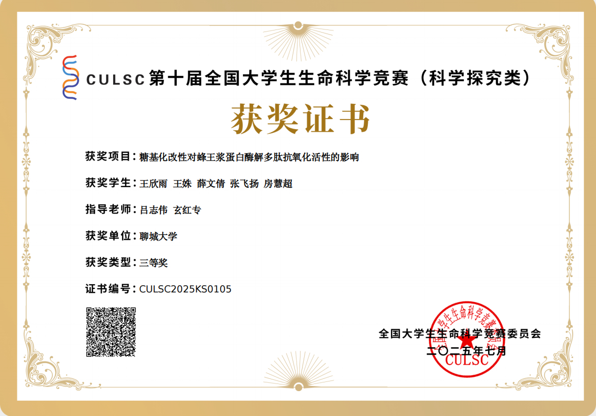 热烈祝贺无码影片 薛文倩荣获CULSC第十届全国大学生生命科学竞赛(科学探究类)三等奖