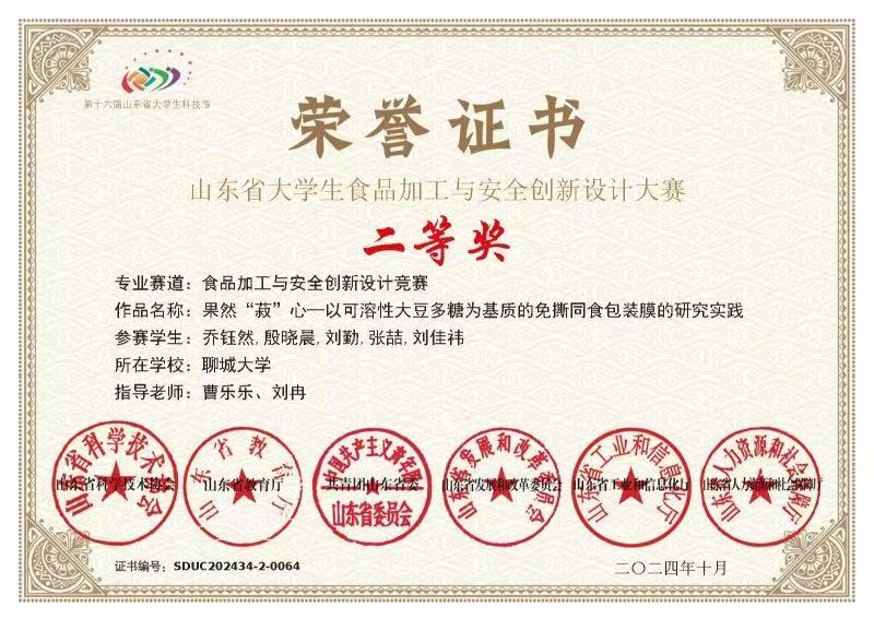 热烈祝贺无码影片 刘勤荣获山东省大学生食品加工与安全创新设计大赛二等奖