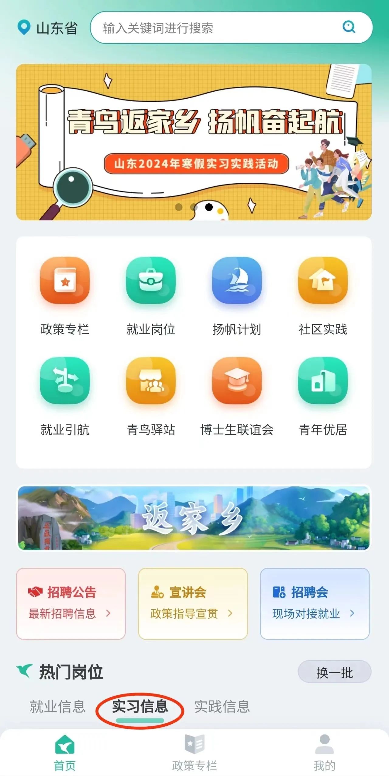 6、在“主页”下方“实习信息”查看意向服务地实习岗位信息,选择心仪的岗位,分别经所在学院团委和用人单位审核通过后,待用人单位通知后开始实习实践。