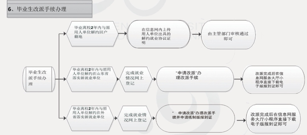 改派:指毕业生离校时已经落实就业单位,且报到证已经签发到用人单位的,在改派期内(自毕业起