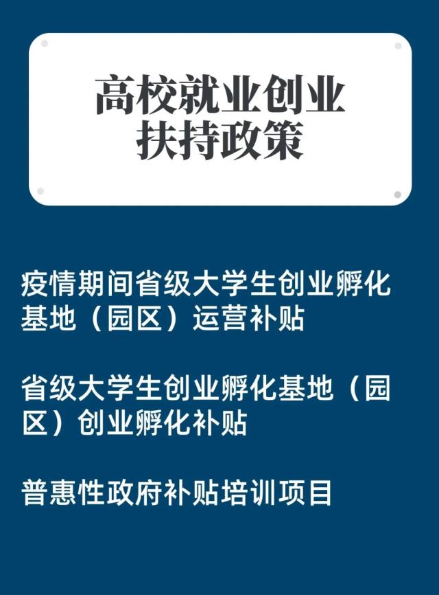 政策内容:高校依法设立并经省人力资源社会保障厅认定或备案,促进就业成效明显的大学生创业孵化基地、大学生创业园区可向省人力资源社会保障厅申请创业孵化补贴。每个基地、园区补贴期限最长不超过3年。